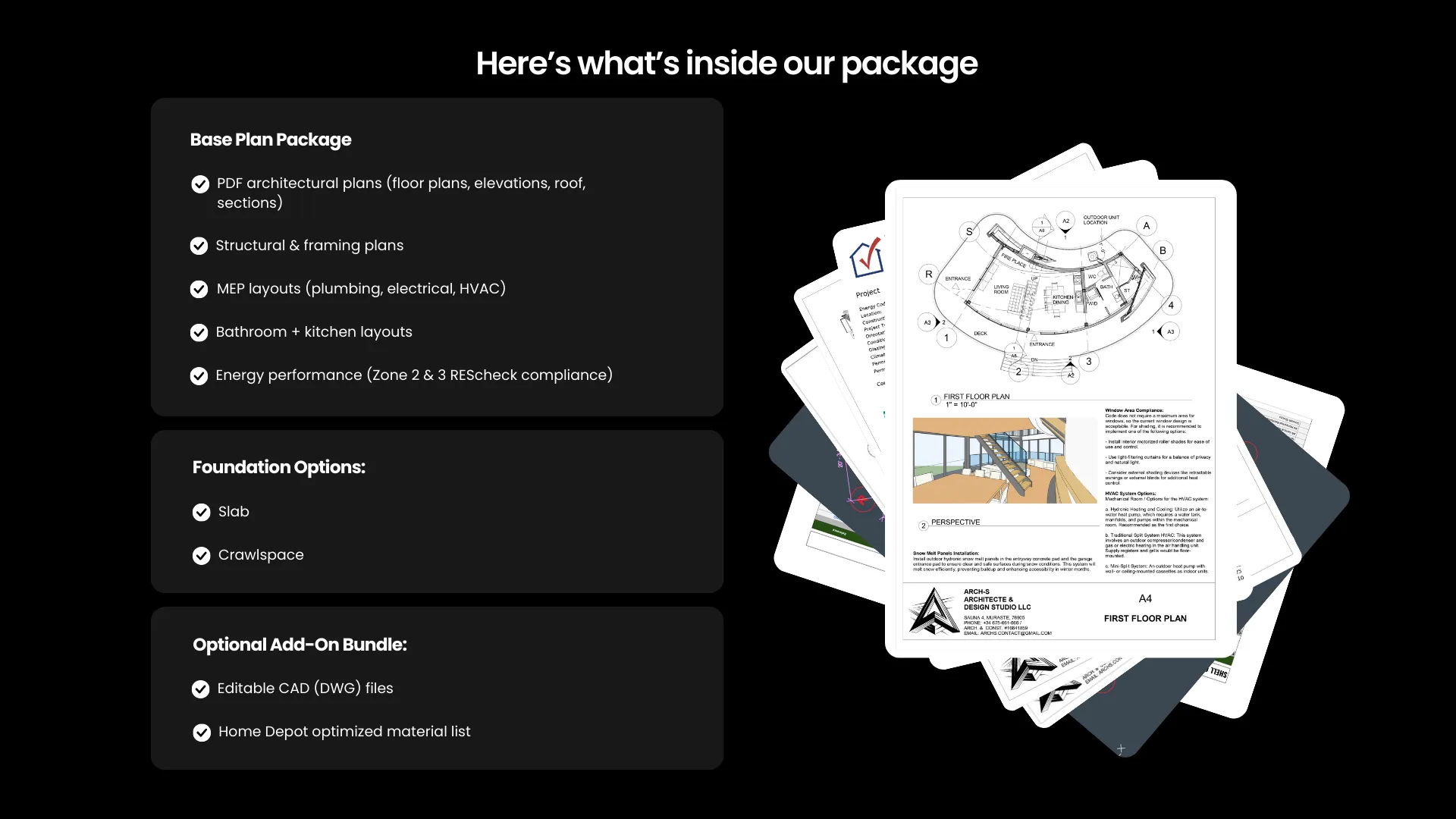 Go from uncertainty, delays, and generic plans to clear cost breakdowns, permit-ready plans, and full code compliance so you can build with confidence from day one.